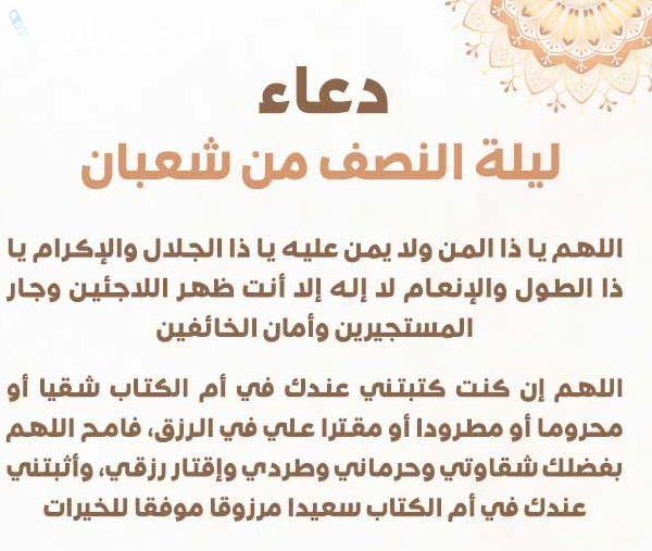 - اللهم اجعل ليلة النصف من شعبان فرصة لنا لمغفرة الذنوب، ولتيسير الأمور، ولتحقيق الأمنيات، ولا تجعلها آخر عهدنا بالشهر الكريم.