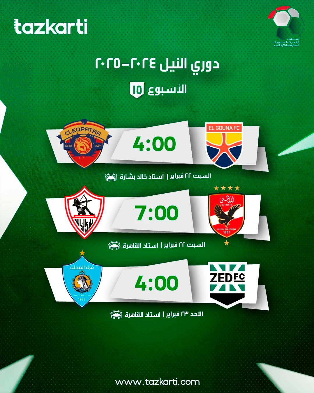 بينما تستكمل مباريات الجولة الخامسة عشرة من الدوري يوم السبت، حيث سيواجه الجونة فريق سيراميكا كليوباترا في الساعة الرابعة عصرا بتوقيت القاهرة، ويواجه الأهلي نظيره الزمالك في السابعة مساء، والمصري البورسعيدي في مواجهة الإسماعيلي