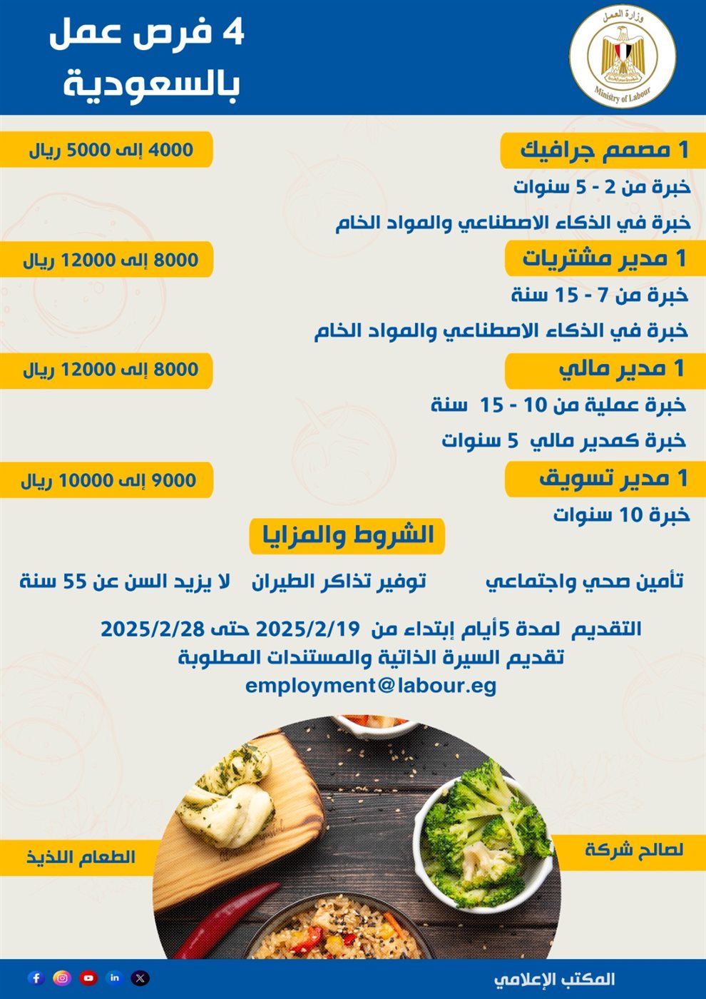 أعلن وزير العمل، محمد جبران، اليوم الأربعاء، توفير 4 فرص عمل لكوادر مصرية للعمل في شركة الطعام اللذيذ، بالمملكة العربية السعودية.