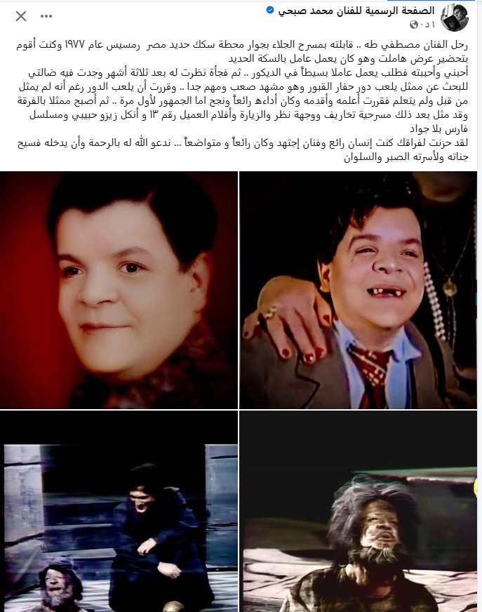 وأضاف محمد صبحي: وقررت أن يلعب الدور رغم أنه لم يمثل من قبل ولم يتعلم فقررت أعلمه وأقدمه وكان أداءه رائعًا ونجح اما الجمهور لأول مرة.. ثم أصبح ممثلا بالفرقة وقد مثل بعد ذلك مسرحية تخاريف ووجهة نظر والزيارة وأفلام العميل رقم 13 وأنكل زيزو حبيبي ومسلسل فارس بلا جواد، لقد حزنت لفراقك كنت إنسان رائع وفنان اجتهد وكان رائعًا ومتواضعا.. ندعو الله له بالرحمة وأن يدخله فسيح جناته ولأسرته الصبر والسلوان.