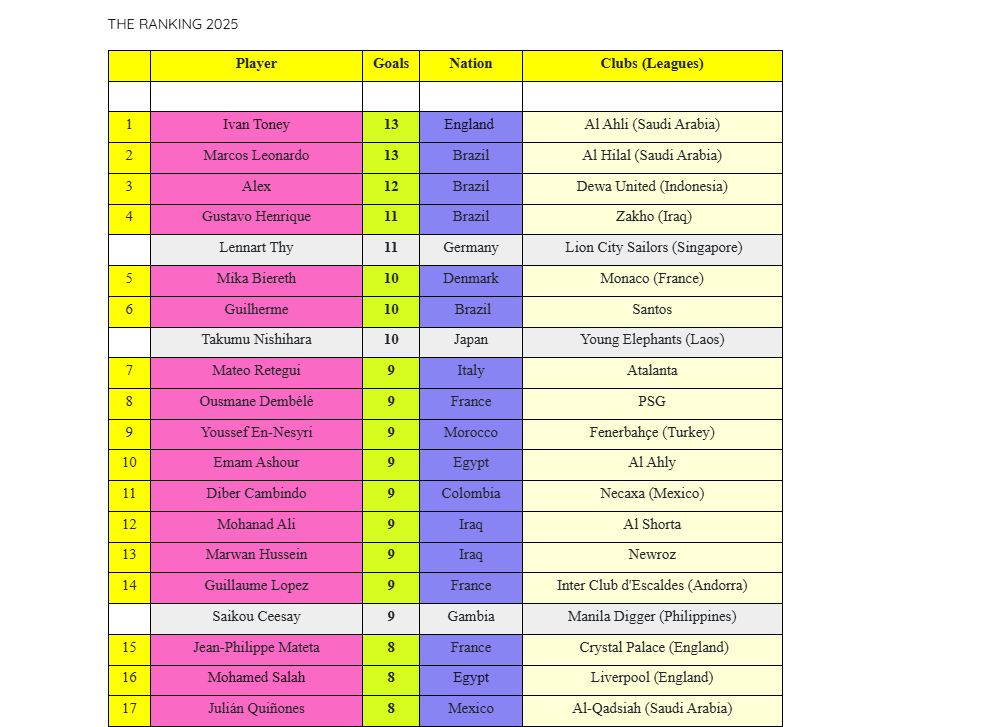 وتواجد إمام عاشور لاعب الأهلي فى المركز العاشر برصيد 9 أهداف، والدولي المصري محمد صلاح لاعب ليفربول الإنجليزي فى المركز 16 بتسجيله 8 أهداف.