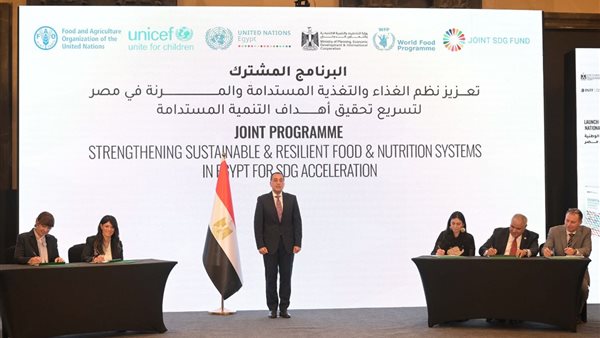 شهد الدكتور مصطفى مدبولي، رئيس مجلس الوزراء، توقيع وثيقة البرنامج المشترك لمشروع تعزيز نظم الغذاء والتغذية المستدامة والمرنة في مصر لتسريع تحقيق أهداف التنمية المستدامة، الذي يتم تنفيذه بالشراكة بين الجهات الوطنية، ومنظمات الأمم المتحدة الشريكة، والمجتمع المدني والقطاع الخاص والمؤسسات المالية الدولية، وذلك خلال فعالية إطلاق الاستراتيجية الوطنية المتكاملة للاستدامة وتمويل التنمية في مصر، المقامة اليوم بالعاصمة الإدارية الجديد.