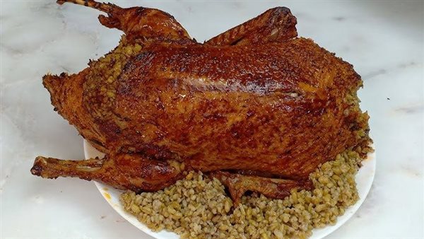 - بعد أن يهدأ الفريك من الحرارة قومي بحشو البط بالفريك من الداخل ثم أغلقي على الحشوة بالكبد والقوانص.