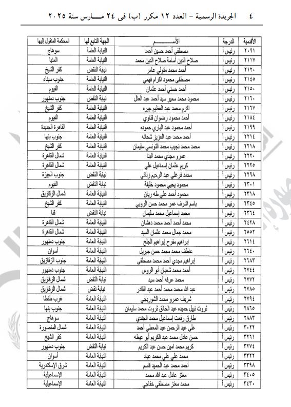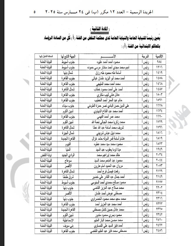 نشرت الجريدة الرسمية قرارا من الرئيس عبد الفتاح السيسي رئيس الجمهورية، بشأن تعيين رؤساء بالمحاكم الابتدائية من الفئة (أ)، ورؤساء بالنيابة العامة.