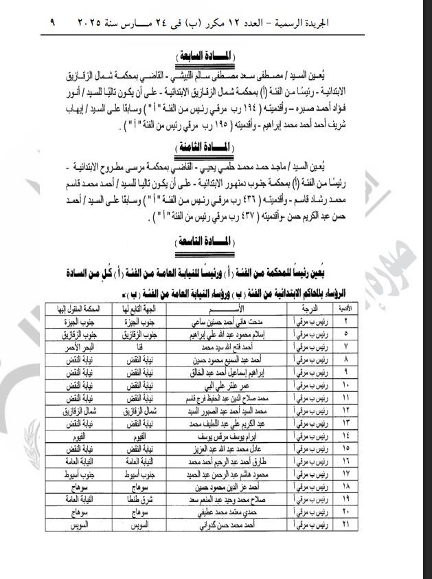 ونص القرار على أنه بعد الاطلاع على الدستور وعلى القانون رقم ٤٦ لسنة ۱۹۷۲ بشأن السلطة القضائية وعلى موافقات مجلس القضاء الأعلى بجلساته المعقودة في (٢٠٢٤/٧/١٤ وبناء على ما عرضه وزير العدل نت التالي المدرج أسماؤهم في الجريدة الرسيمة.