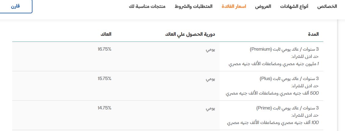 ويبلغ الحد الأدنى للشهادة الأولى Premium مليون جنيه ومضاعفات الألف جنيه بعائد يومي 16.75%، والشهادة الثانية Plus بعائد يومي 15.75% بداية من 500 ألف جنيه ومضاعفات الألف جنيه.