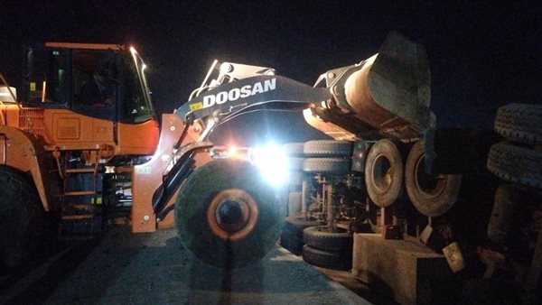 الدفع بمعدات ثقيلة لرفع آثار انقلاب سيارة نقل محملة بالبطاطس على الطريق الإقليمي