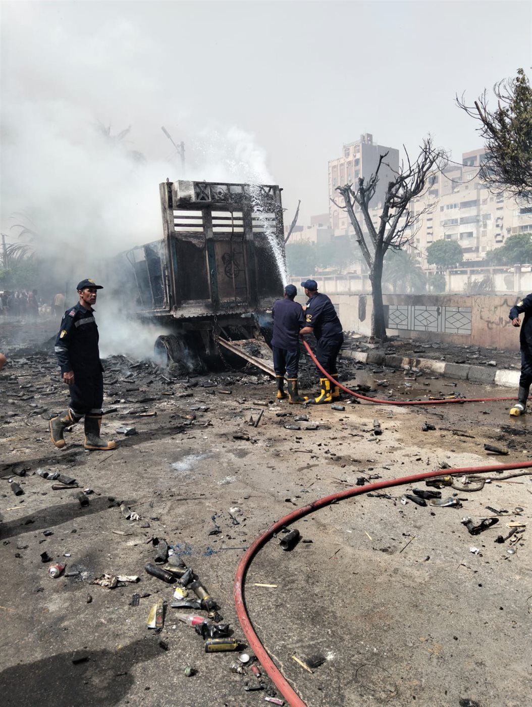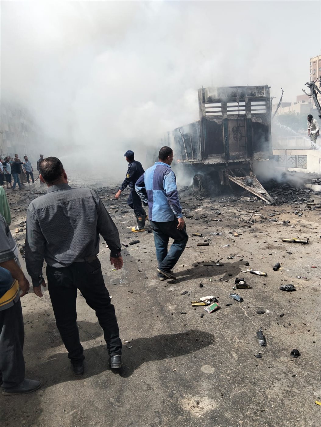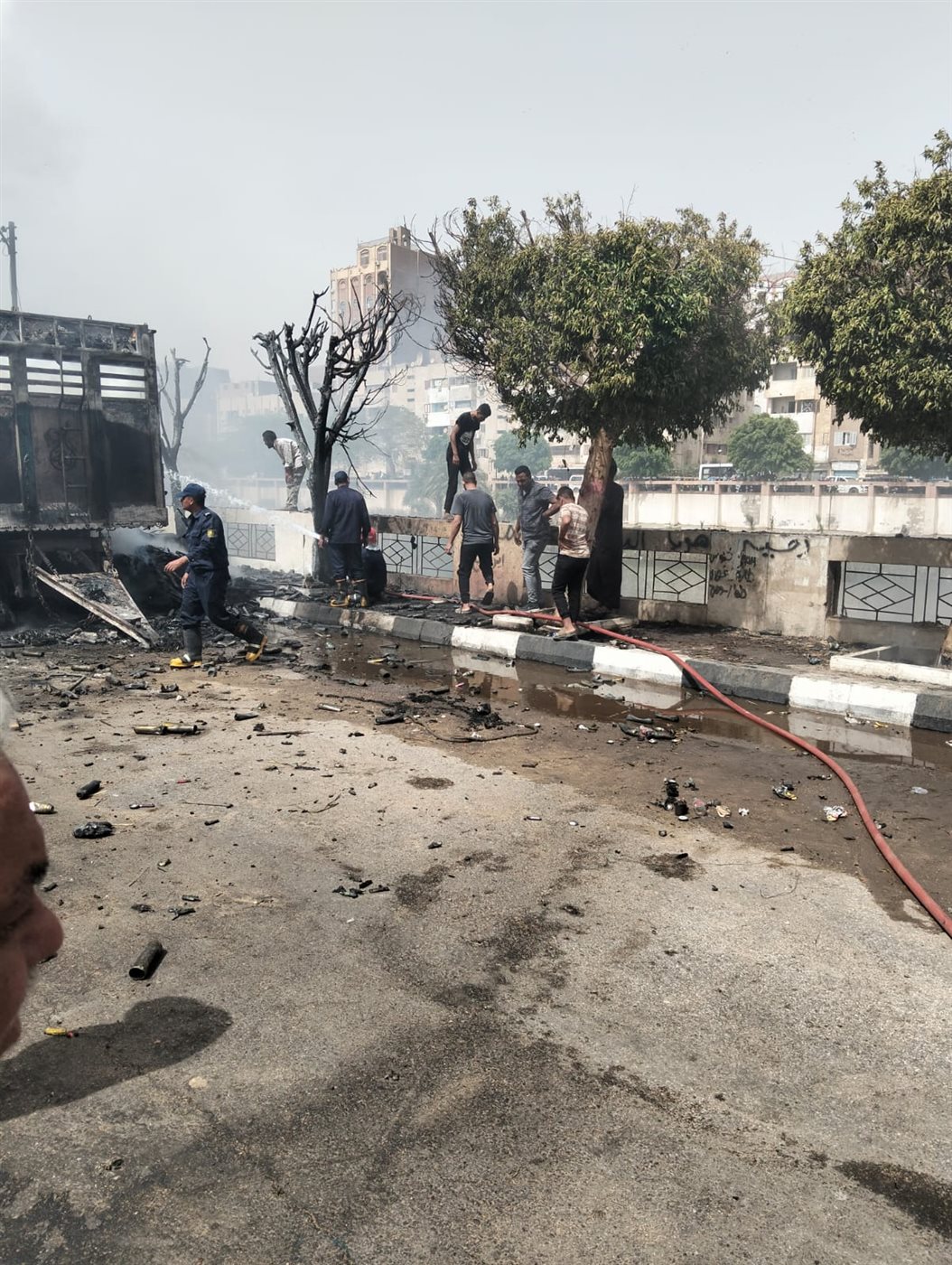الدفع بـ 3 سيارات إطفاء للسيطرة على حريق في مقطورة تابعة لشركة شحن في سوهاج | صور