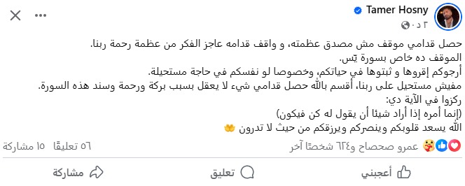 وكتب تامر حسني منشورا، عبر حسابه الشخصي بموقع التواصل الاجتماعي فيس بوك، قال فيه: حصل قدامي موقف مش مصدق عظمته، وواقف قدامه عاجز الفكر من عظمة رحمة ربنا، الموقف ده خاص بسورة يّس.