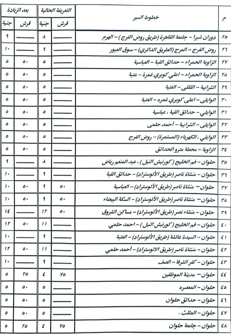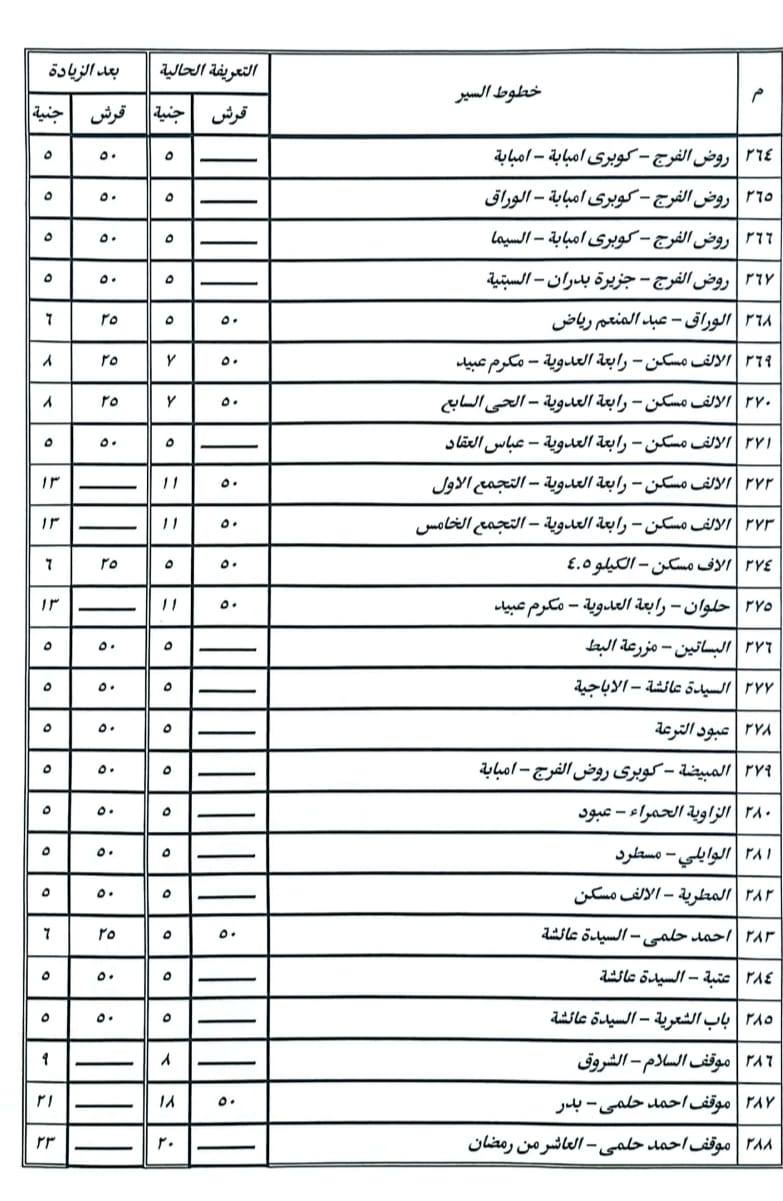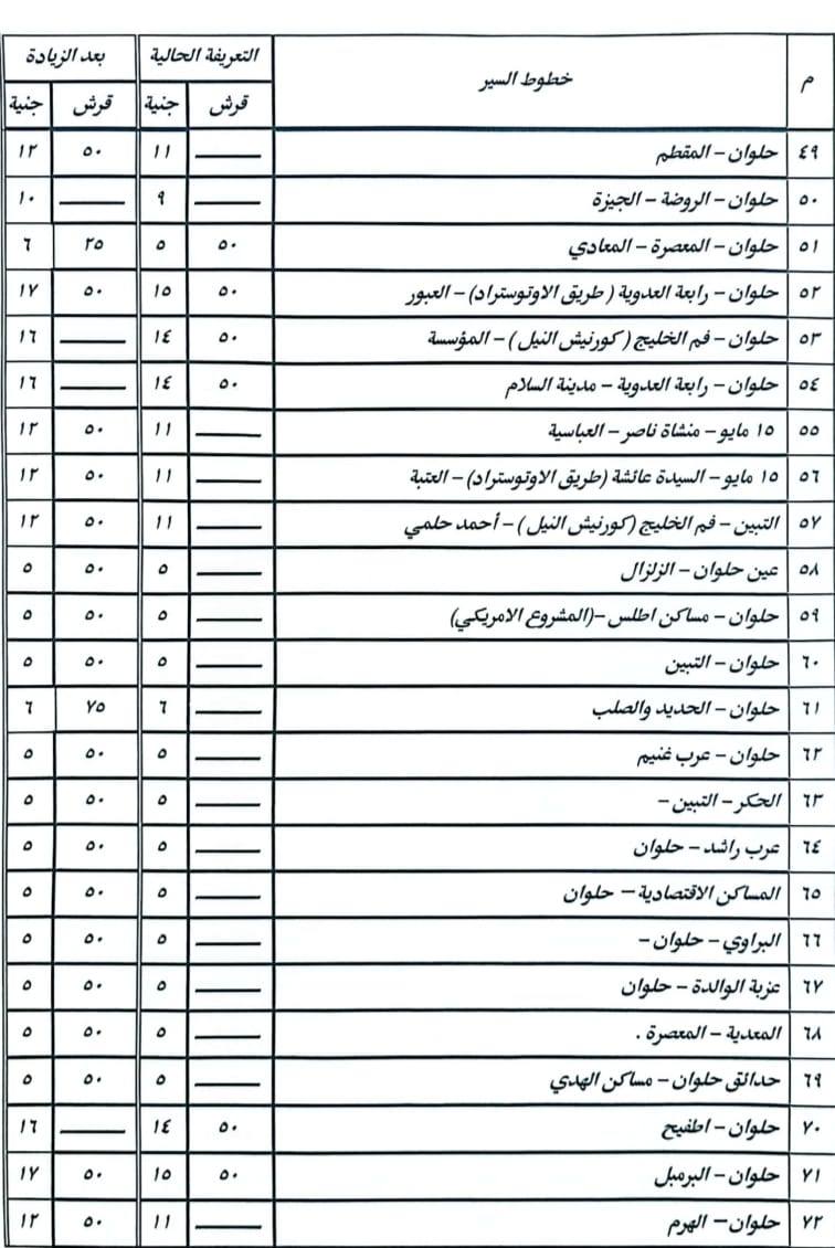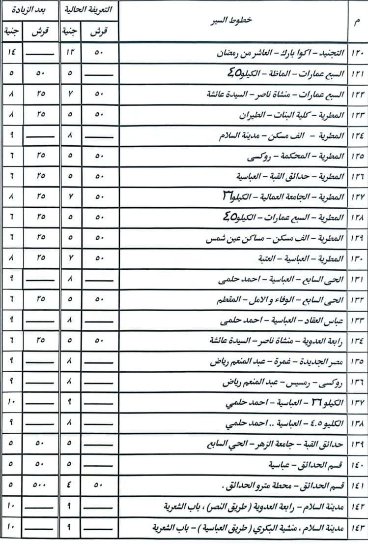 وأشار محافظ القاهرة إلى أنه تم مراعاة مصلحة المواطن والسائق فى التعريفة الجديدة، وكانت الزيادة ١٠% على معظم الخطوط، ولم تتجاوز ١٥% فى الخطوط الطويلة.