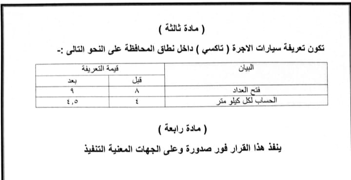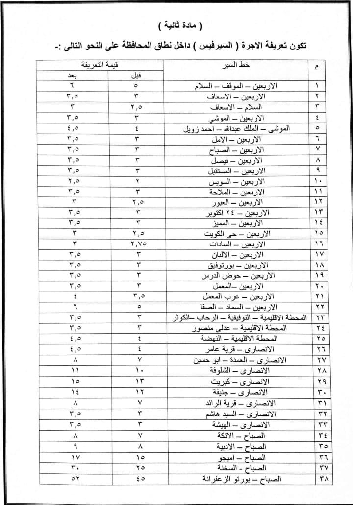 وجاءت تعريفة سيارات الأجرة بين السويس وباقي المحافظات كالتالي: