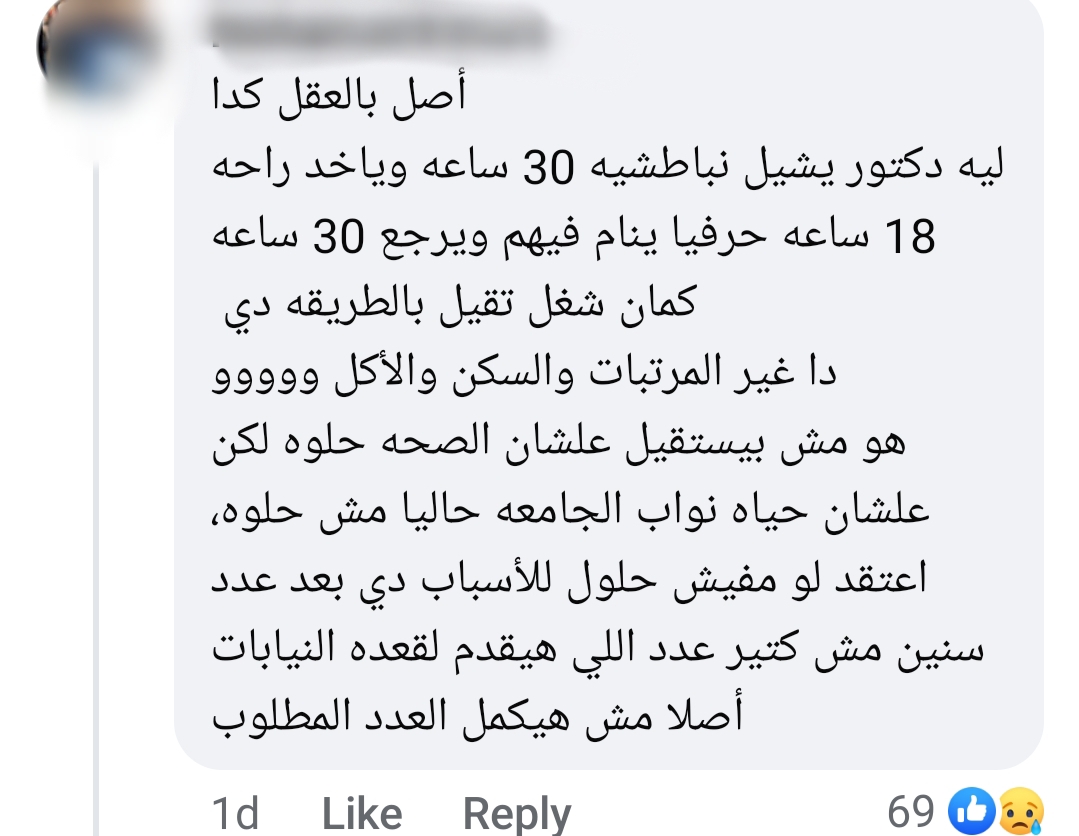 «اللي حصل طبيعي، دول أطباء تعبوا سنين في الدراسة والتدريب مقابل رواتب لا تليق ومع بيئة عمل مرهقة وغير آمنة».. بهذه الكلمات علقت رانيا.س.م؛ أحد الأطباء الخريجين، مشيرة إلى كلية الطب جامعة الإسكندرية تفرض قيودا أكبر من نظيرها بالجامعات الأخرى، وعلى سبيل المثال جعل سنوات الانتداب 5 بدلا من 3، وتم تسكينهم في نبطشيات لفترات تتراوح 30 ساعة، ومقابل رواتب متدنية للغاية، وظروف عمل قاسية، وفي نهاية الفترة لا يتم تعيينهم، حيث يتم تثبيت 10% من المنتدبين فقط.