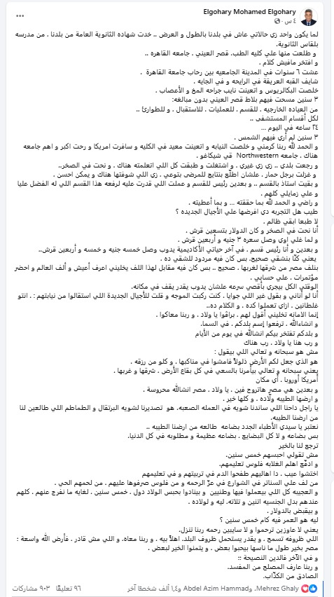 وكتب الدكتور الجوهري محمد الجوهري عبر حسابه على موقع التواصل الاجتماعي فيس بوك: لما يكون واحد زي حالاتي عاش في بلدنا بالطول والعرض، خدت شهاده الثانوية العامة من بلدنا، من مدرسة بلقاس الثانوية، وطلعت منها على كلية الطب، قصر العيني، جامعة القاهرة، وأفتخر ما فيش كلام، عشت 6 سنوات في المدينة الجامعية بين رحاب جامعة القاهرة، شايف القبة العريقة في الرايحة والجاية خلصت البكالوريوس واتعينت نائب جراحة المخ والأعصاب.