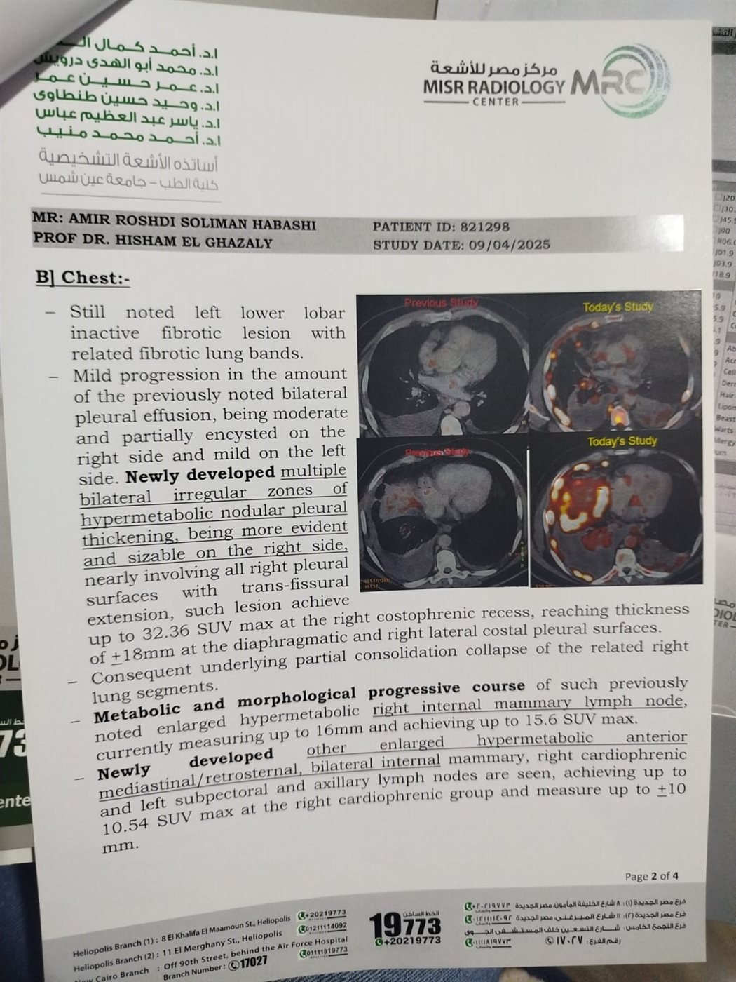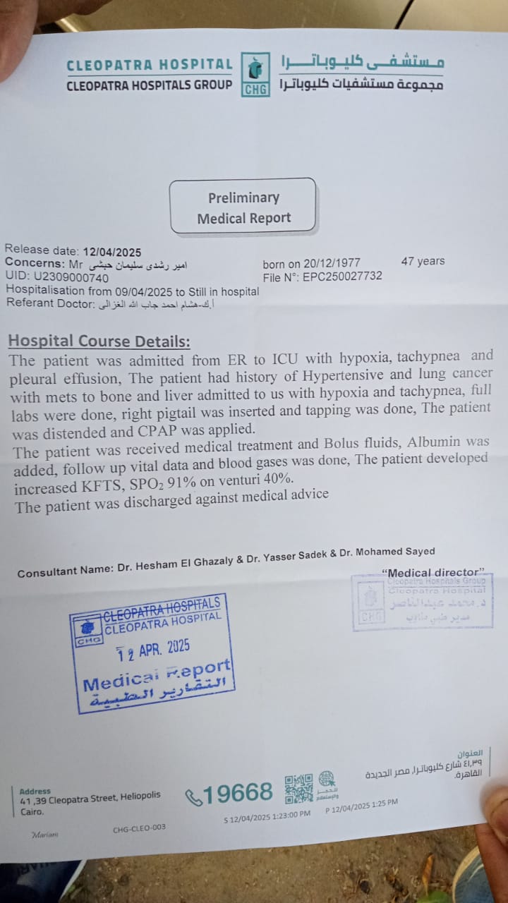 وأفادت التقارير الطبية بأنه تم حجز المريض بقسم الرعاية المُركزة وهو يعاني من نقص نسبة الأكسجين بالدم وارتشاح رئوي مع وجود ورم بالرئتين وثانويات بالجسم، وتم عمل الفحوصات الطبية اللازمة وتركيب قسطرة بذل وعمل بذل للارتشاح الرئوي، وتم وضع المريض على العلاج الدوائي اللازم والأكسجين مع المتابعة، وما زال المريض يعاني من فشل تنفسي وقد أوصى استشاري القلب ببدء أدوية السيولة والمريض بالرعاية المُركزة لتلقي العلاج اللازم.