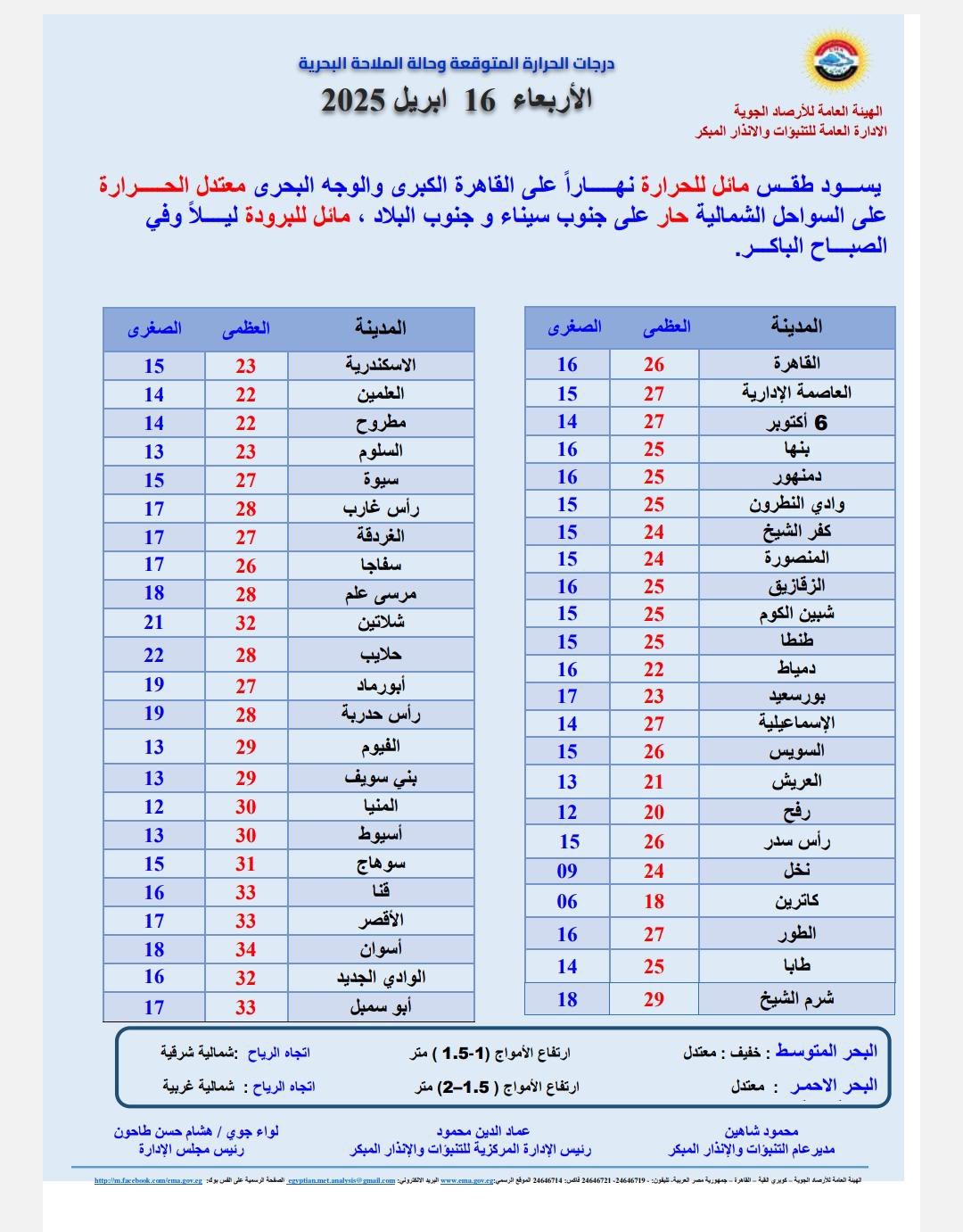 وستكون درجات الحرارة كما رصدتها الهيئة العامة للأرصاد الجوية على المحافظات والمراكز كالتالي:-