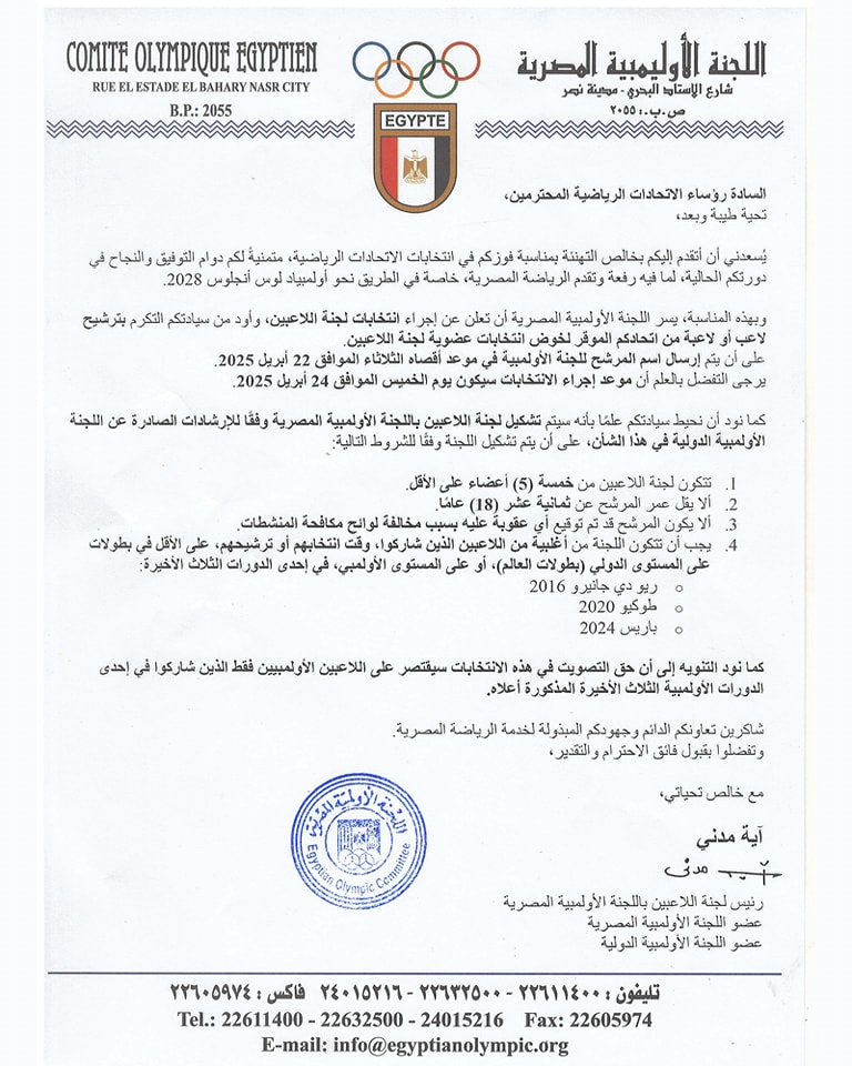 يسر اللجنة الأولمبية المصرية أن تعلن إجراء انتخابات لجنة اللاعبين، وأود منكم التكرم بترشيح لاعب أو لاعبة من اتحادكم الموقر لخوض انتخابات عضوية لجنة اللاعبين.