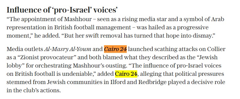 أبرزت صحيفة The Telegraph البريطانية، في تقرير موسّع لها حول الأزمة التي تضرب نادي داجنهام آند ريدبريدج الإنجليزي، تغطية موقع القاهرة 24 الإخباري، الذي تناول القضية من زاوية تأثير ما وصفه بـ اللوبي الصهيوني على قرارات النادي، بعد إقالة المديرة المصرية سلمى مشهور على خلفية منشورات داعمة لفلسطين.