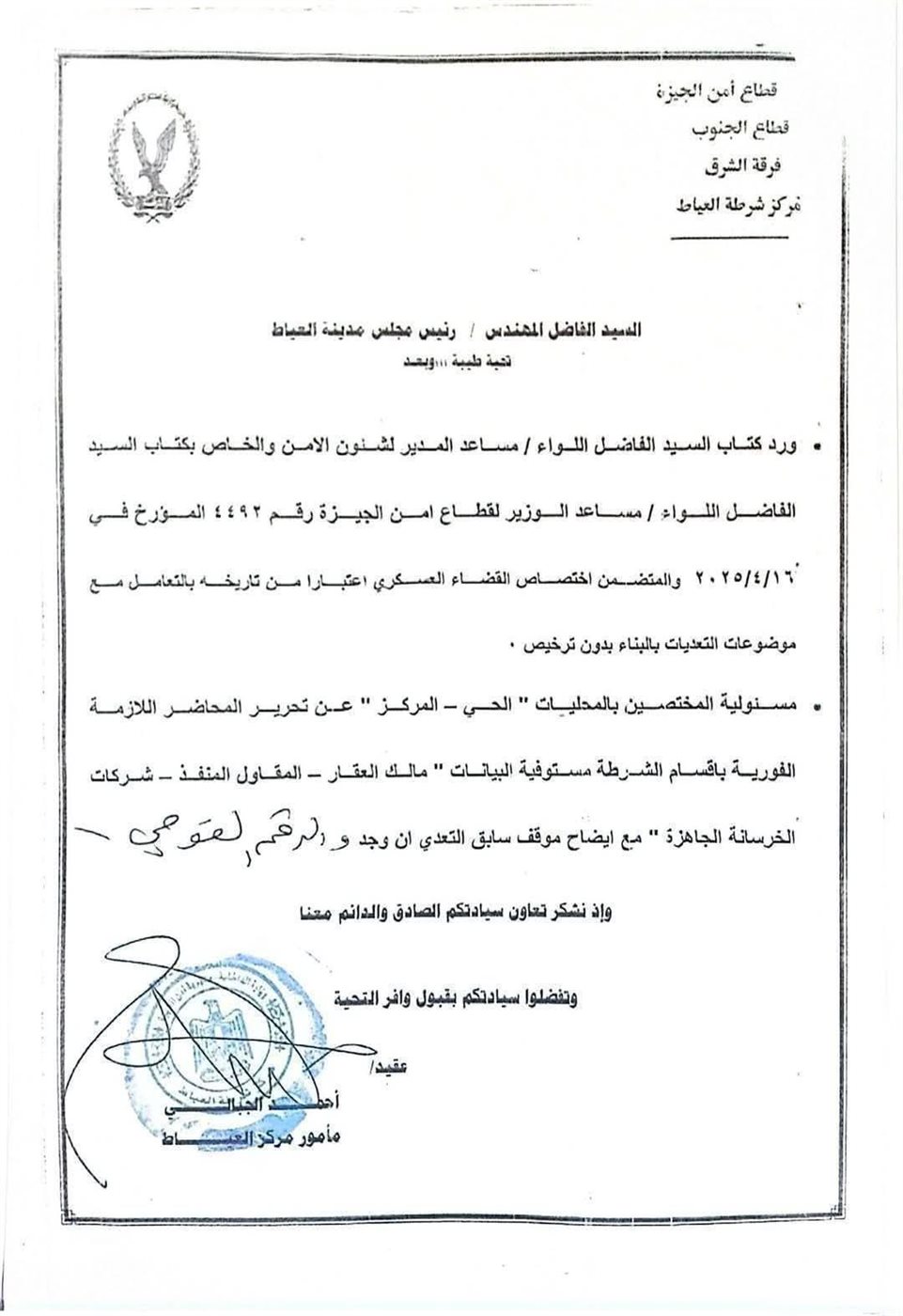 وتضمن الخطاب الوارد من مساعد المدير للشئون الأمنية، والمرسل بناء على كتاب السيد اللواء مساعد الوزير لقطاع أمن الجيزة رقم 4492المؤرخ في 16أبريل 2025، ما يفيد باختصاص القضاء العسكري اعتبارًا من هذا التاريخ بالتعامل مع كافة موضوعات التعديات بالبناء بدون ترخيص.