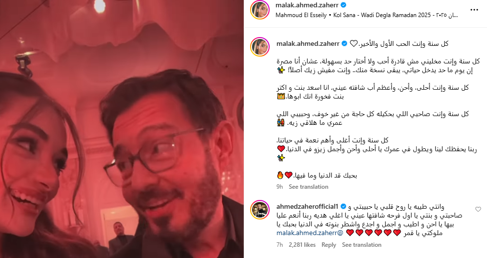 ونشرت ملك أحمد، الصور عبر حسابها بإنستجرام، وعلقت عليها: كل سنة وأنت الحب الأول والأخير، كل سنة وأنت مخليني مش قادرة أحب ولا أختار حد بسهولة، عشان أنا مُصرة إن يوم ما حد يدخل حياتي، يبقى نسخة منك.. وأنت مفيش زيك أصلًا!، كل سنة وأنت أحلى، وأحن وأعظم أب شافته عيني، أنا أسعد بنت وأكتر بنت فخورة إنك أبوها، كل سنة وأنت صاحبي اللي بحكيله كل حاجة من غير خوف، وحبيبي اللي عمري ما هلاقي زيه.. كل سنة وأنت أغلى وأهم نعمة في حياتنا، ربنا يحفظك لينا ويطول في عمرك يا أحلى وأحن وأجمل زيزو في الدنيا.. بحبك قد الدنيا وما فيها.