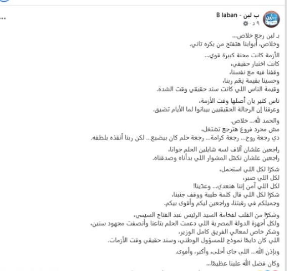 وأضاف البيان: رجعنا خلاص.. وخلاص أبوابنا هتفتح من بكره تاني، الأزمة كانت محنة كبيرة قوي، وكانت اختبار حقيقي، وقفنا فيه مع نفسنا، وحسينا بقيمة نِعَم ربنا، وقيمة الناس اللي كانت سند حقيقي وقت الشدة.