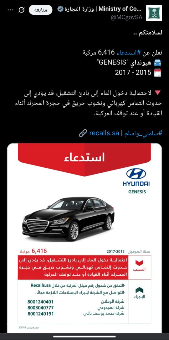أعلنت وزارة التجارة السعودية عبر حسابها الموثق على منصة إكس استدعاء حوالي 6400 سيارة جينيسيس.