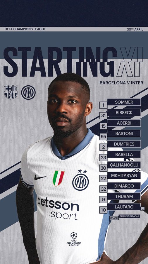 في المقابل، أعلن سيموني إنزاجي المدير الفني لفريق الإنتر عن التشكيل الرسمي الذي سيخوض به مباراة برشلونة والذي جاء كالتالي:ـ
