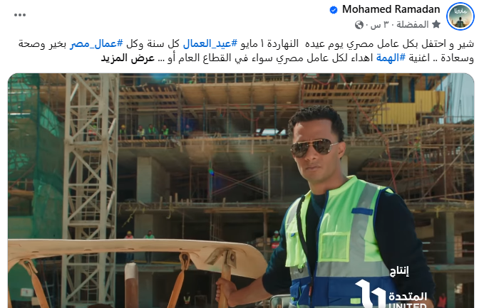 وكتب محمد رمضان منشورا، عبر حسابه الشخصي بموقع التواصل الاجتماعي فيس بوك، قال فيه: احتفل بكل عامل مصري يوم عيده النهاردة 1 مايو عيد العمال كل سنة وكل عمال مصر بخير وصحة وسعادة.. أغنية الهمة إهداء لكل عامل مصري سواء في القطاع العام أو الخاص.. الأغنية دي ألحان الشيخ سيد مكاوي.