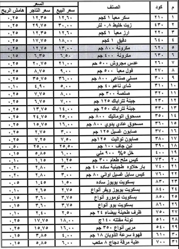 وأعلنت وزارة التموين، القائمة الرسمية لأسعار السلع التموينية المدعمة لشهر مايو، لاستقرار الأسواق وضمان توفير السلع الأساسية بأسعار مناسبة لجميع المواطنين، وتشمل القائمة 31 منتجًا مختلف من المواد الاساسية والمنظفات، تمثلت في الآتي: