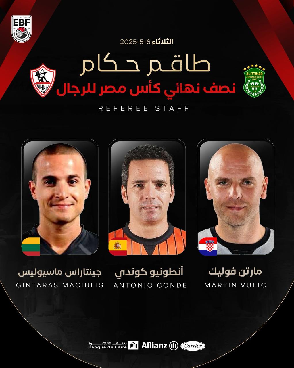 أعلن الاتحاد المصري لكرة السلة برئاسة عمرو مصيلحي، عن طاقم التحكيم الأجنبي الذي سيدير مواجهتي الزمالك والاتحاد السكندري، في نصف نهائي كأس مصر لكرة السلة رجال، ومباراة نهائي كأس مصر، والذي تم ترشيحه من قبل الاتحاد الدولي لكرة السلة FIBA.