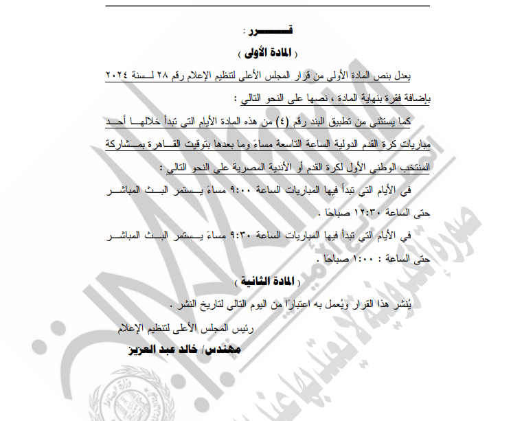 نشرت جريدة الوقائع المصرية قرارًا جديدًا للمجلس الأعلى للإعلام حول مواعيد بث البرامج الرياضية.