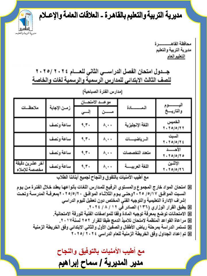 جدول امتحانات الصف الثالث الابتدائي الترم الثاني محافظة القاهرة 2025 صباحي