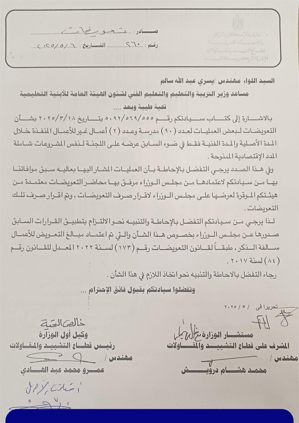 وأكد أن الخطاب الثاني بمثابة سؤال للهيئة العامة للأبنية التعليمية لبيان أحقية المقاول في صرف التعويضات حسب المدد الزمنية الثلاث (الأصلية والفنية والإضافية)، وذلك لتسهيل إجراءات الصرف دون تأخير أو تحميل المقاول غرامات عن مدد لا يتحمل مسؤوليتها.