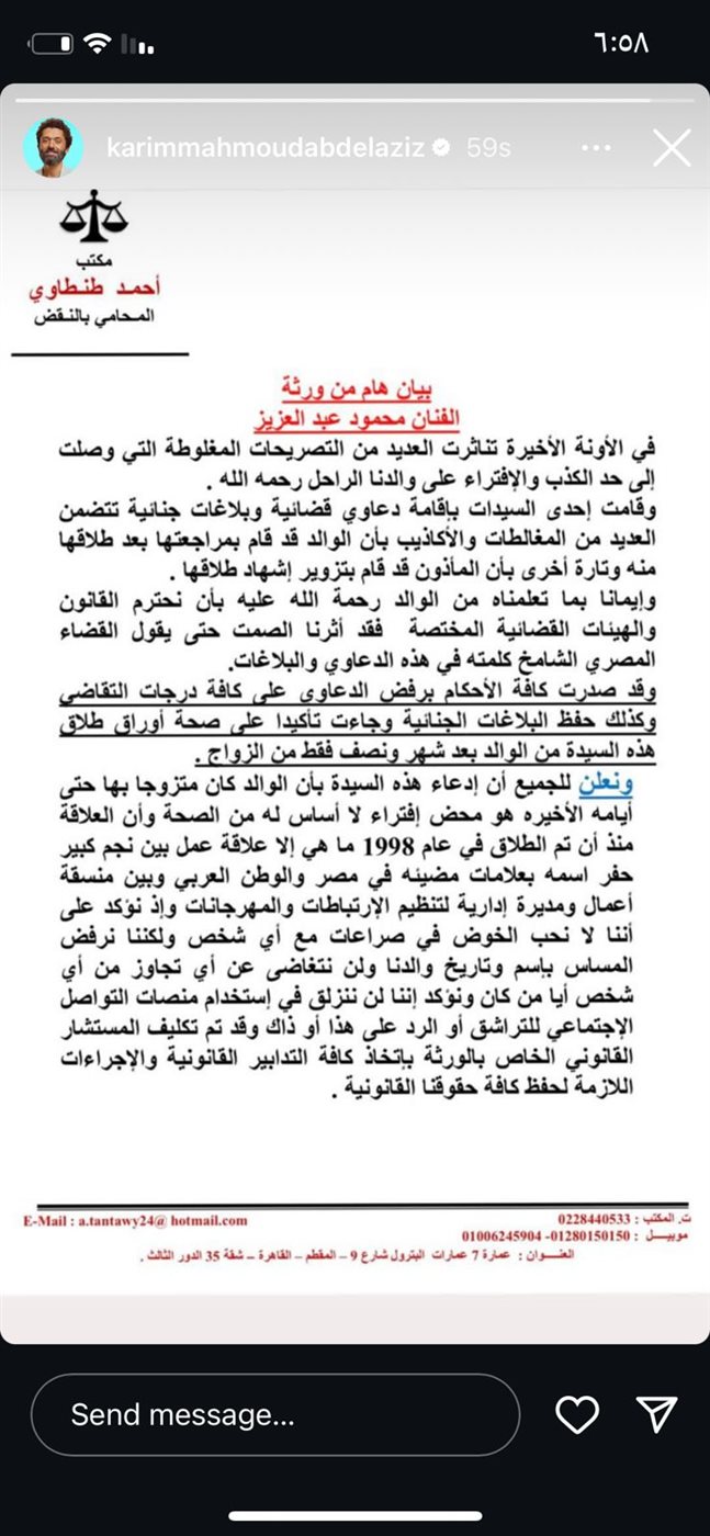 أصدر كريم محمود عبد العزيز بيانًا بشأن ميراث والده الراحل محمود عبد العزيز، مشددًا على أنه سيتم اتخاذ الإجراءات القانونية وعدم السماح بالتجاوز مرة أخرى.