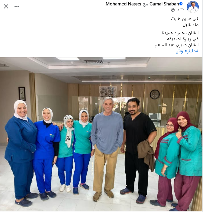 ونشر الدكتور جمال شعبان صورة من زيارة الفنان محمود حميدة، لـ صبري عبد المنعم، حيث حرص الفنان على أن يلتقط صورًا مع طاقم التمريض، ونشر شعبان الصورة عبر حسابه الشخصي بموقع التواصل الاجتماعي فيس بوك، وعلق عليها قائلا: منذ قليل الفنان محمود حميدة في زيارة لصديقه الفنان صبري عبد المنعم.