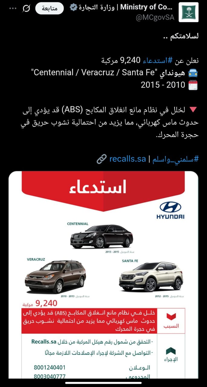 أعلنت وزارة التجارة السعودية عبر حسابها الموثق على منصة إكس، استدعاء 9240 سيارة هيونداي.
