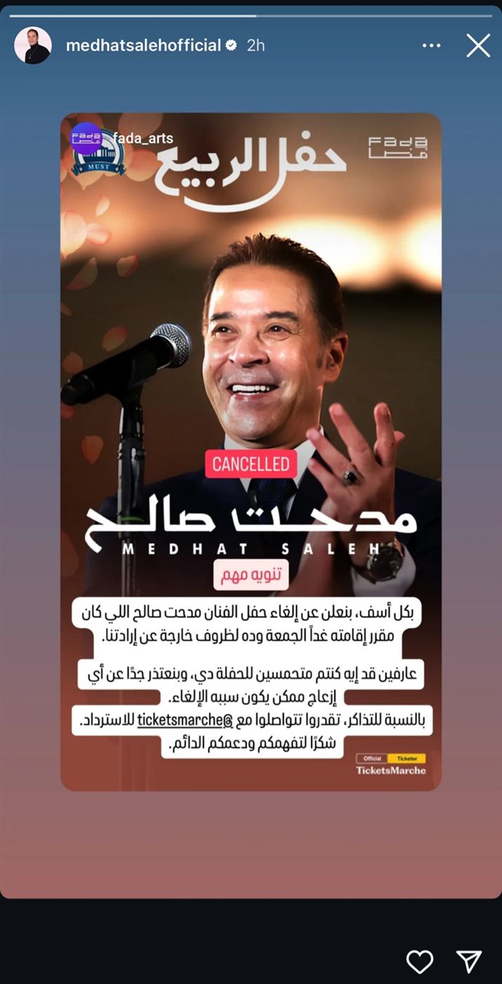 وشاركت الصفحة الرسمية لـ الفنان مدحت صالح، بيان الشركة المنظمة عبر خاصية الاستوري، وجاء فيه: بكل أسف، نعلن إلغاء حفل الفنان مدحت صالح اللي كان مقرر إقامته غدًا الجمعة وده لظروف خارجة عن إرادتنا، عارفين قد إيه كنتم متحمسين للحفلة دي، وبنعتذر جدا عن أي إزعاج ممكن يكون سببه الإلغاء، وبالنسبة للتذاكر، تقدروا تتواصلوا مع ticketsmarche للاسترداد، شكرا لتفهمكم ودعمكم الدائم.