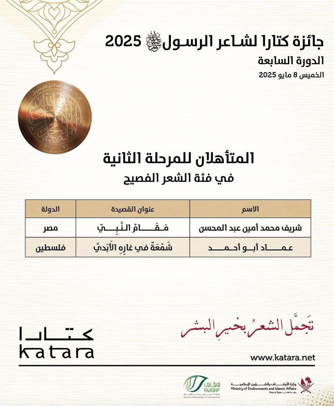 وتأهل الزميل شريف محمد أمين للمرحلة الثانية من جائزة كتارا لشاعر الرسول في دورتها السابعة، والمقامة بالعاصمة القطرية الدوحة، بقصيدته الشهيرة “مقام النبي”، بالتنافس مع الشاعر الفلسطيني عماد أبو أحمد، صاحب قصيدة “شمعة في غاره الأبدي”.