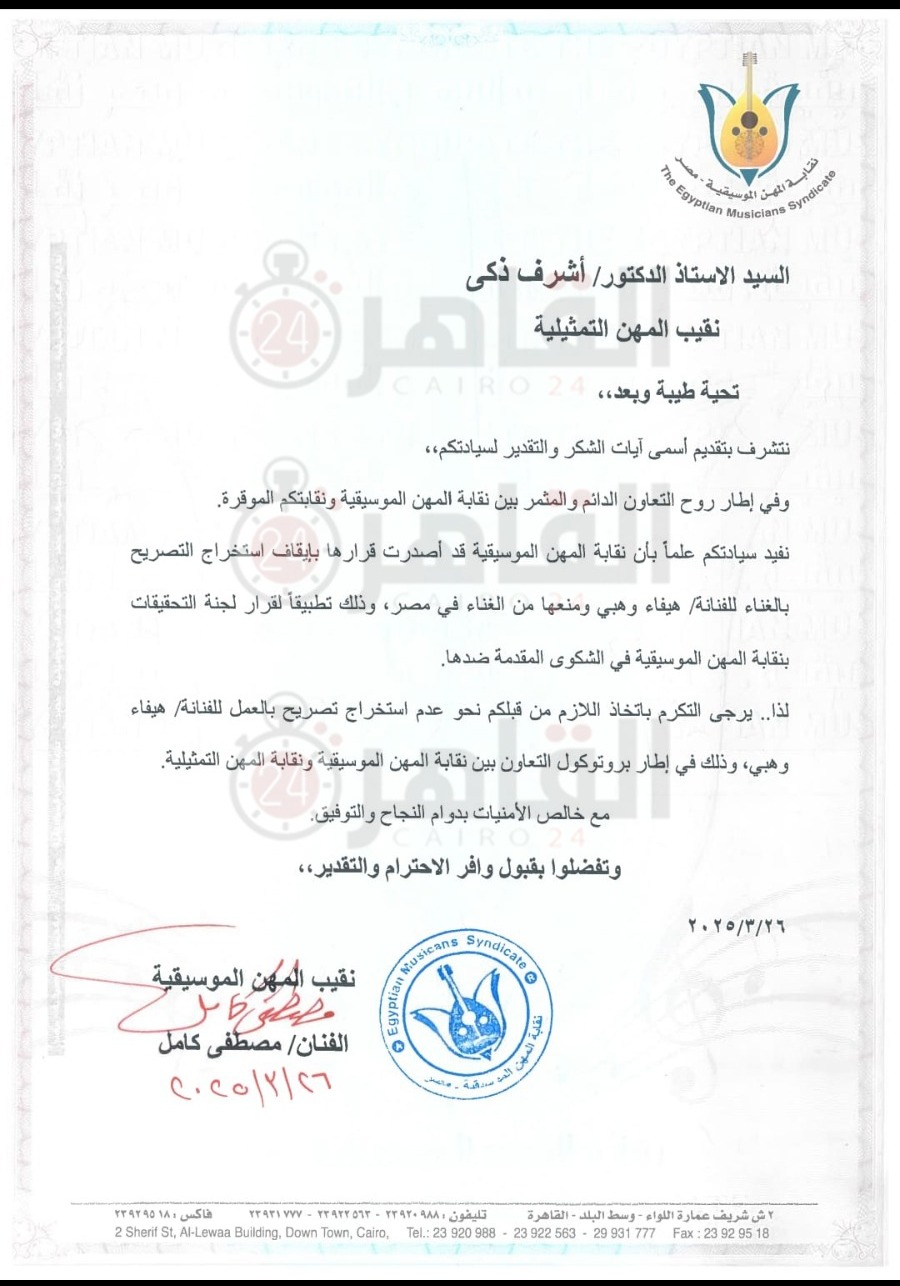 وعلم القاهرة 24، أن نقابة المهن الموسيقية أخطرت في وقت سابق نقابة المهن التمثيلية برئاسة الفنان أشرف زكي، بعدم إصدار تصاريح للفنان هيفاء وهبي، لممارسة نشاطها الفني داخل مصر، وذلك بموجب بروتوكل التعاون بين النقابات الفنية الثلاثة، وذلك كان أثناء أزمة إيقافها على خلفية الشكوى المقدمة من مدير أعمالها السابق خالد التهامي.
