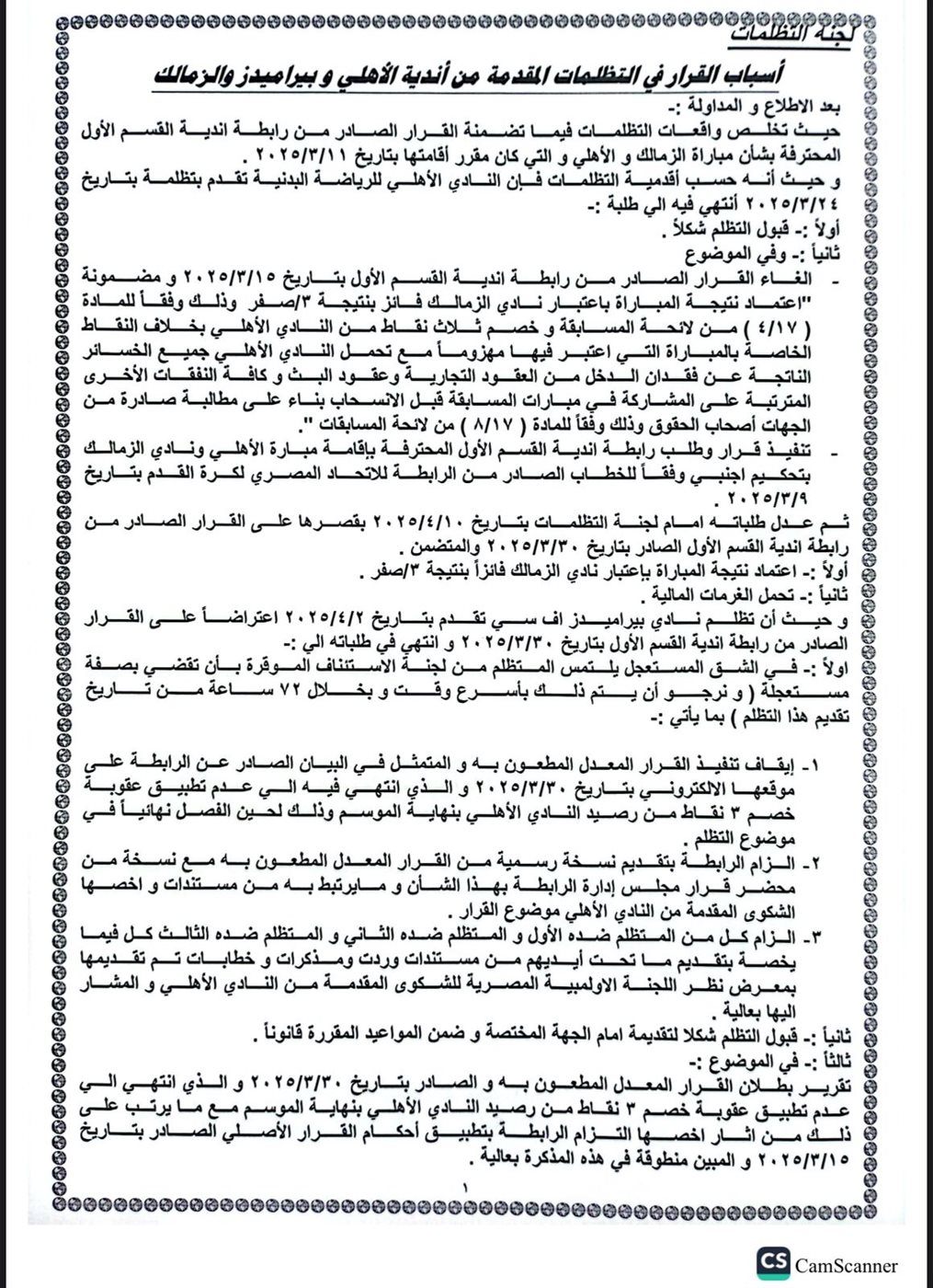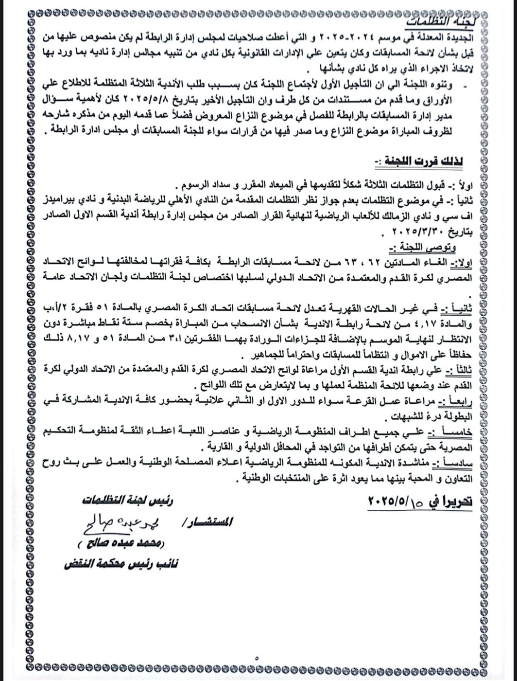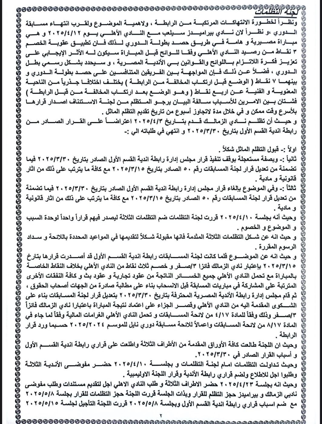 جاء ذلك بسبب نهائية القرار الصادر من مجلس إدارة رابطة أندية القسم الأول بتاريخ 30 مارس 2025، والذي اعتبر الأهلي خاسرًا للمباراة بنتيجة 3-0 دون خصم 3 نقاط من رصيده في نهاية الموسم. وأكدت اللجنة أن هذا القرار نهائي وغير قابل للطعن.