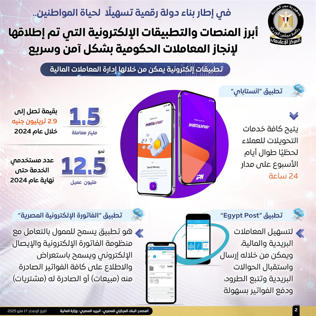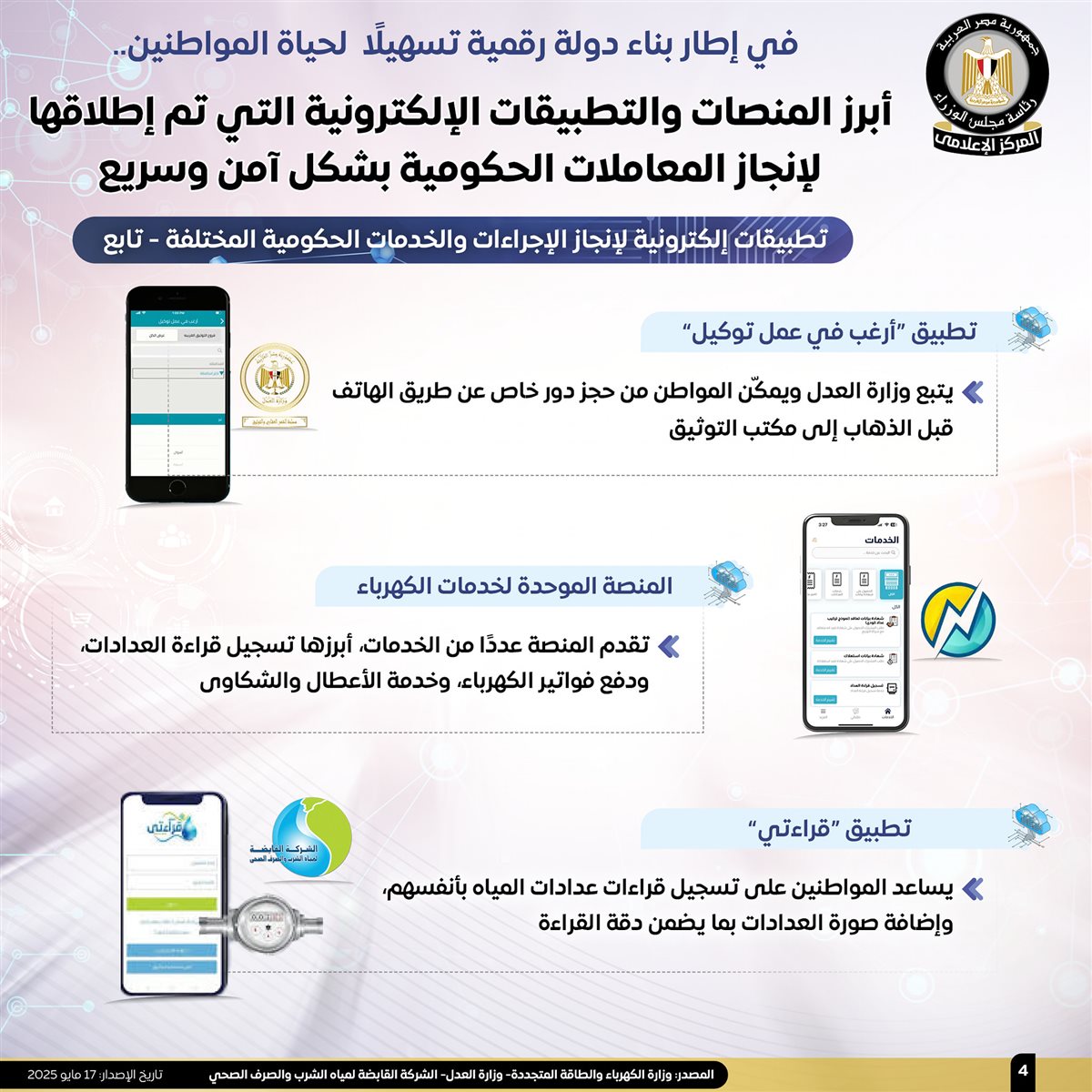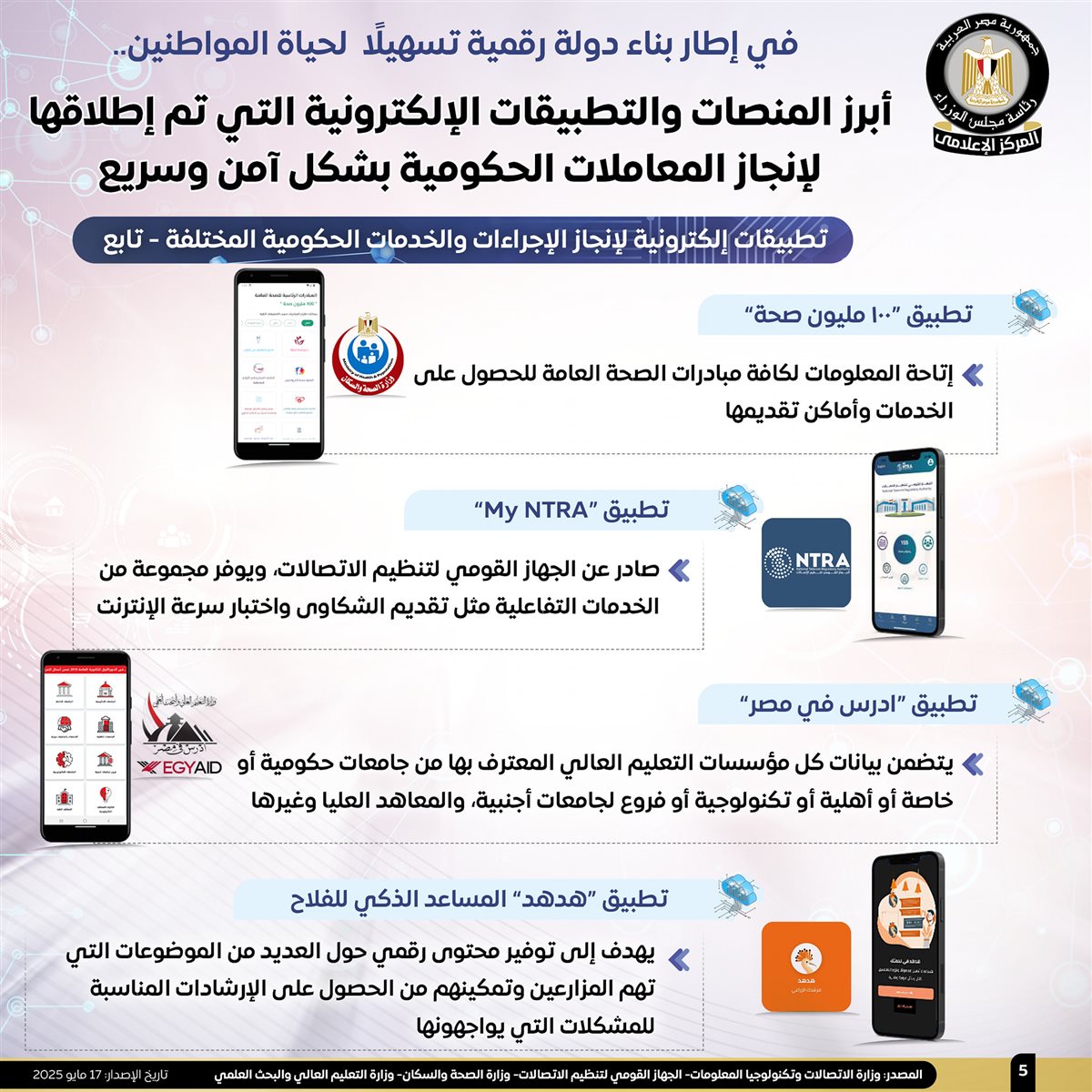 استعرض المركز الإعلامي لمجلس الوزراء، أبرز المنصات والتطبيقات الإلكترونية التي تم إطلاقها لإنجاز المعاملات الحكومية بشكل آمن وسريع وذلك في إطار بناء دولة رقمية تسهيلًا لحياة المواطنين.