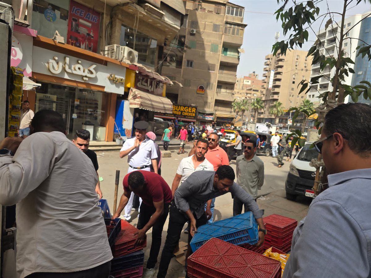 وأضاف البيان بالإضافة إلى رفع الباعة المفترشين للطريق العام وفروشات المقاهي بالجزر الوسطى بالطوابق واستاندات المعروضات التابعة لهم وذلك بمتابعة من طه عبد الصادق رئيس حي الهرم، ومصطفى عبد العليم نائب القطاع وبالتعاون مع شرطة المرافق.