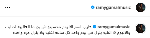 وكتب رامي جمال منشورا، عبر حساباته الشخصية بمواقع التواصل الاجتماعي، قائلا: طيب اسم الألبوم محسبتهاش زي ما الغالبية اختارت، والألبوم 15 أغنية ينزل في يوم واحد كل ساعة أغنية ولا ينزل مرة واحدة.