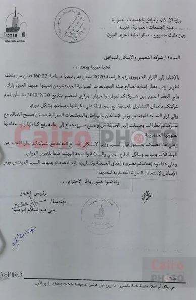 وجاء نص قرار جهاز تطوير منطقة مثلث ماسبيرو ومجرى العيون وممشى أهل مصر: بالإشارة إلى القرار الجمهوري رقم 6 لسنة 2020 بشأن نقل تبعية مساحة 160،22 فدان من منطقة تطوير أرض مطار إمبابة لصالح هيئة المجتمعات العمرانية الجديدة ومن ضمنها حديقة الجيزة بارك، وإلى العقد المبرم بين شركتكم الموقرة والجهاز المركزي للتعمير بتاريخ 2019/2/20 بشأن قيام شركتكم بأعمال التشغيل للحديقة مع المحافظة على مكوناتها وصيانتها بشكل دوري، وإلى قرار المهندس وزير الإسكان والمرافق والمجتمعات العمرانية بشأن فسخ التعاقد مع شركتكم نظرا لما وصلت إليه الحديقة من وضع سيئ يحتاج إلى إعادة رفع كفاءتها واستعادتها صورتها الحضارية.