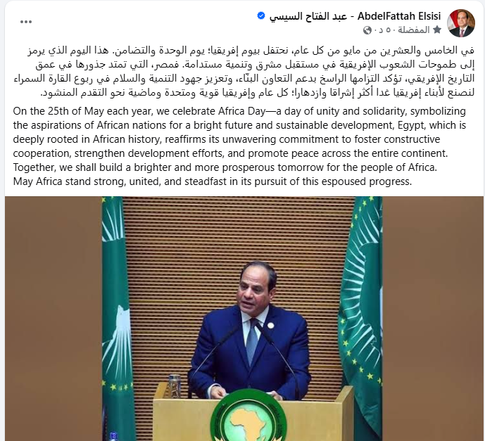 وأضاف الرئيس السيسي، في منشور له على صحفته الرسمية بموقع فيس بوك بمناسبة يوم إفريقيا: مصر التي تمتد جذورها في عمق التاريخ الإفريقي، تظل ملتزمة بدعم التعاون البنّاء وتعزيز جهود التنمية والسلام في ربوع القارة السمراء، بهدف بناء غد أفضل لأبناء إفريقيا.