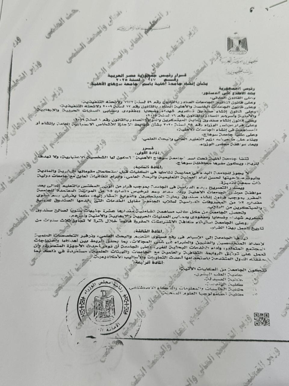 باعتماد 8 كليات.. قرار جمهوري بإنشاء جامعة سوهاج الأهلية| مستند