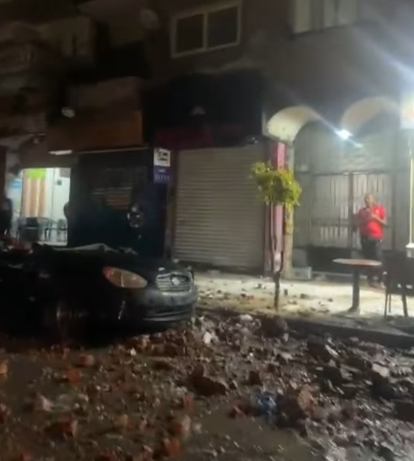 وتبين انهيار أجزاء خارجية من عقار وأسبابها في تحطم سيارتين تصادف مرورهما أسفل العقار.