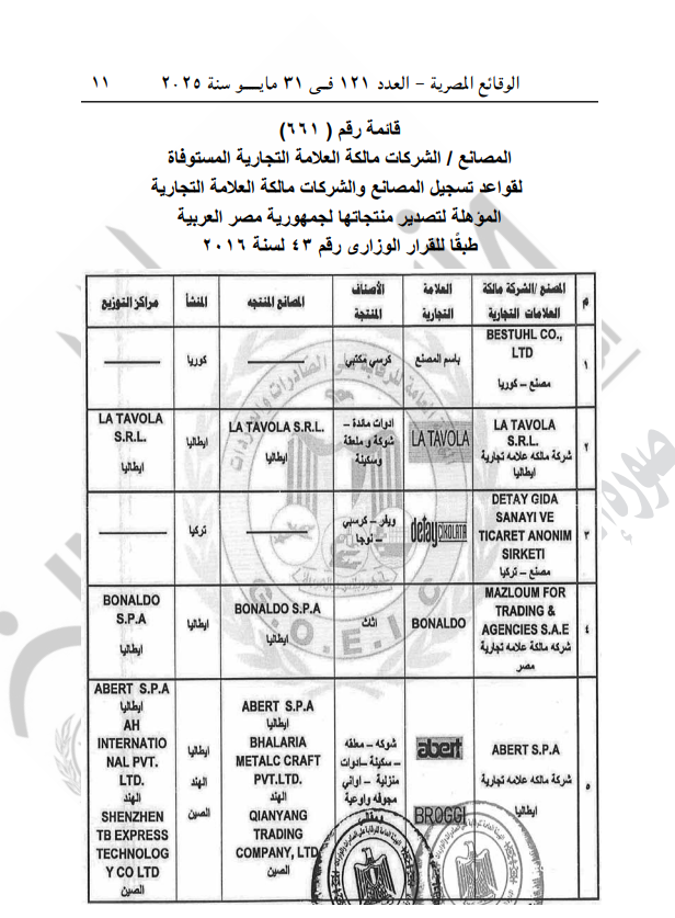 نشرت الجريدة الرسمية، اليوم السبت 31 مايو 2025، قرار الهيئة العامة للرقابة على الصادرات والواردات رقم 510 لسنة 2025، بشأن قيد بعض المصانع والشركات مالكة العلامات التجارية المستوفاة لقواعد تسجيل المصانع المؤهلة لتصدير منتجاتها إلى مصر.