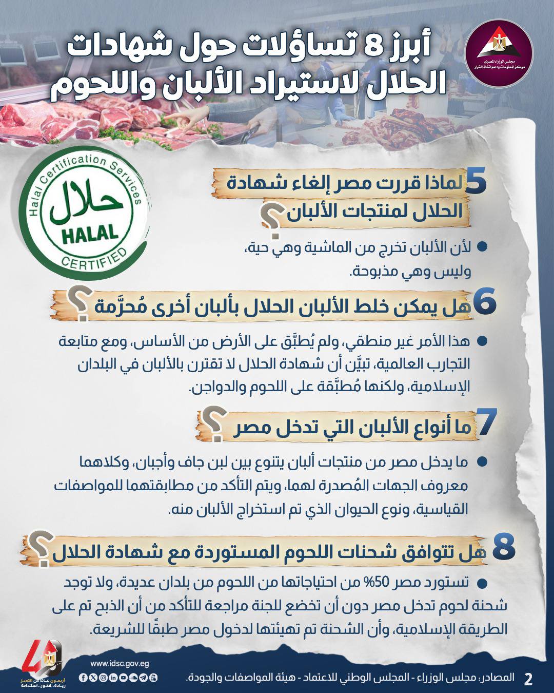 أضاف معلومات الوزراء، عبر صفحته الرسمية على فيسبوك: التجارب العالمية تبين أن شهادة الحلال لا تقترن بالألبان، وما يدخل مصر من منتجات ألبان “لبن جاف وأجبان” معروفة المصدر ويتم التأكد من مطابقتهما للمواصفات ونوع الحيوان المستخرج منه الألبان.