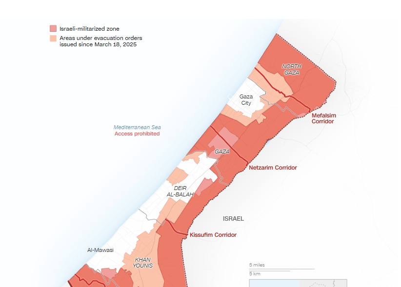 نشرت سي إن إن التقرير بـ 5 خرائط لخطة إسرائيل لاحتلال غزة كاملة، حيث إن الخرائط رصدت، أماكن تمركز جنود الاحتلال الجديدة منذ بداية العدوان حتى الآن، الأماكن المحاصرة والمأمور بإخلائها، الأراضي الزراعية التي دُمرت عن بكرة أبيها، ونسب المجاعة التي يعاني منها الأهالي، والأراضي التي لا يوجد بها أي قطاع طبي للمساعدة.
