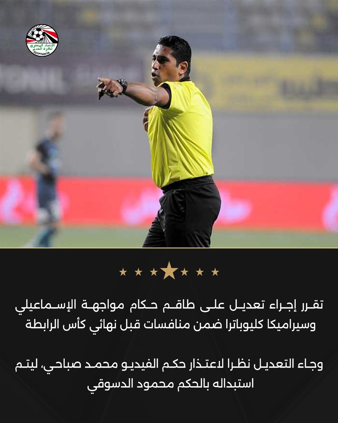 أُجري تعديل على طاقم حكام مواجهة الإسماعيلي وسيراميكا كليوباترا، ضمن منافسات الدور نصف النهائي من بطولة كأس الرابطة، وذلك بعد اعتذار حكم الفيديو محمد صباحي عن إدارة اللقاء.